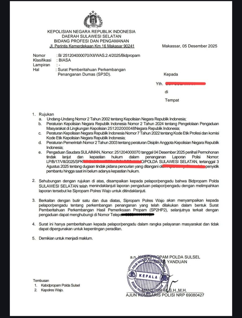 Surat bernomor B/251240000070/XII/WAS.2.4/2025/Bidpropam, tertanggal 5 Desember 2025 itu menegaskan bahwa Bidpropam Polda Sulsel telah menindaklanjuti aduan pelapor dan melakukan pelimpahan laporan tersebut ke Sipropam Polres Wajo untuk pemeriksaan lebih lanjut.