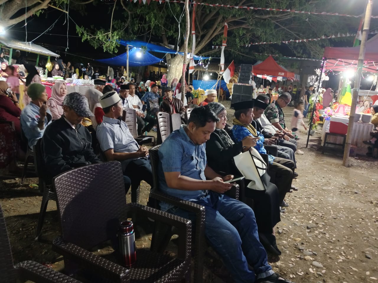 Malam harinya, denyut pasar yang biasanya dipenuhi tawar-menawar harga, berganti menjadi pesta rakyat. Lampu-lampu berpendar, musik rakyat mengalun, dan senyum-senyum sederhana mekar di wajah para pedagang serta keluarga mereka. Pasar, yang sehari-hari menjadi ruang ekonomi, malam itu menjelma menjadi ruang kebersamaan. Tidak hanya para pappasar yang meramaikan malam penuh kebersamaan itu. Dideretan kursi tamu yang disiapkan, nampak sejumlah tokoh masyarakat yang hadir, termasuk salah seorang anggota DPRD Polman, Amir, dan mantan anggota DPRD, Busman M.Yunus.